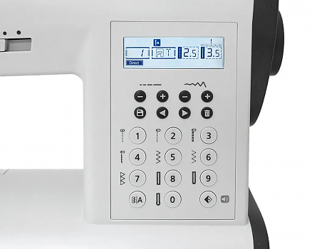 Управляйте машиной с помощью нескольких нажатий кнопок. Дисплей позволяет видеть параметры строчки, отображает настройку различных функций. Помимо простого ввода номера выбранной строчки вы можете изменить ее ширину и длину стежка, которые устанавливаются автоматически. Также на панели вы найдете ряд кнопок для быстрого перехода к наиболее востребованным швейным операциям.